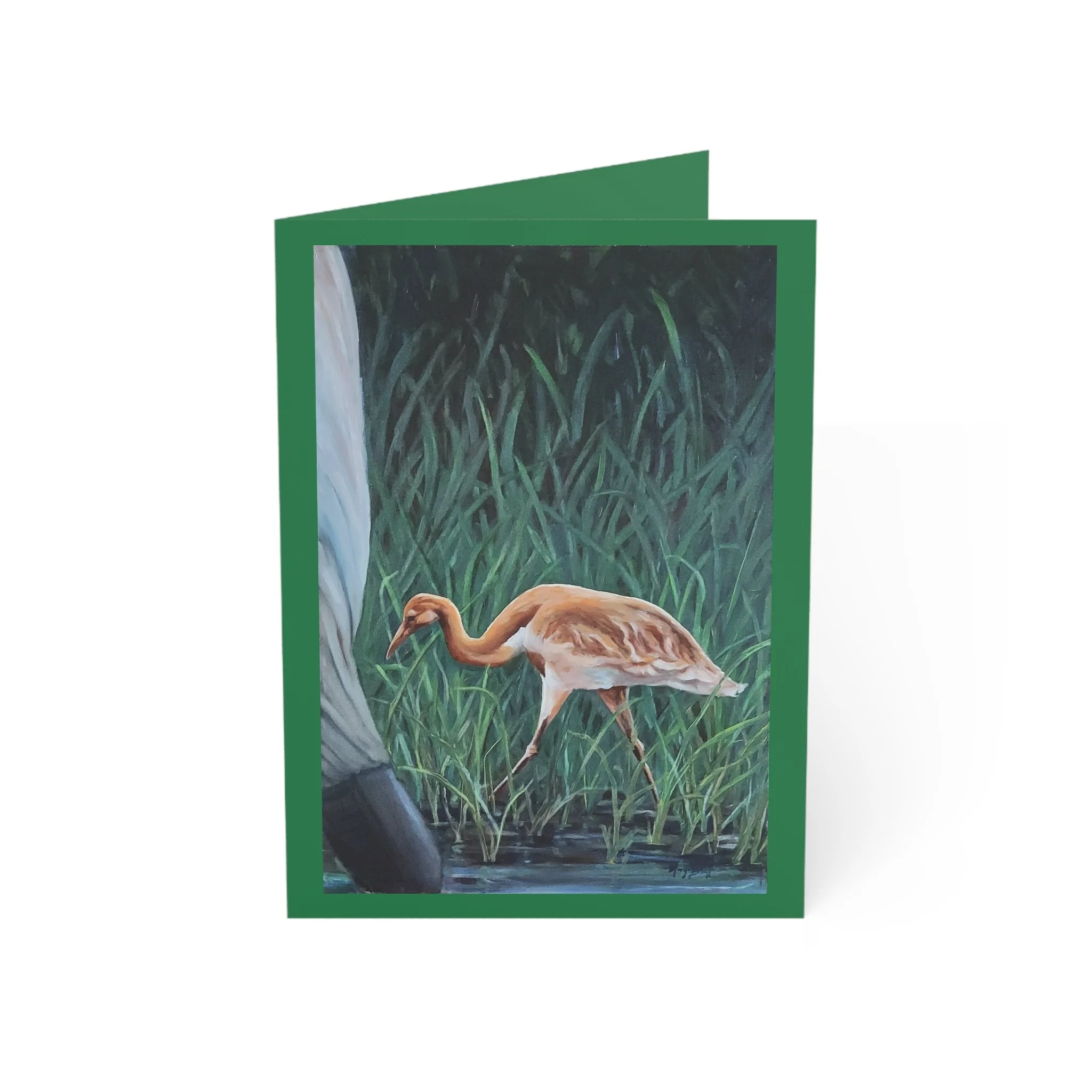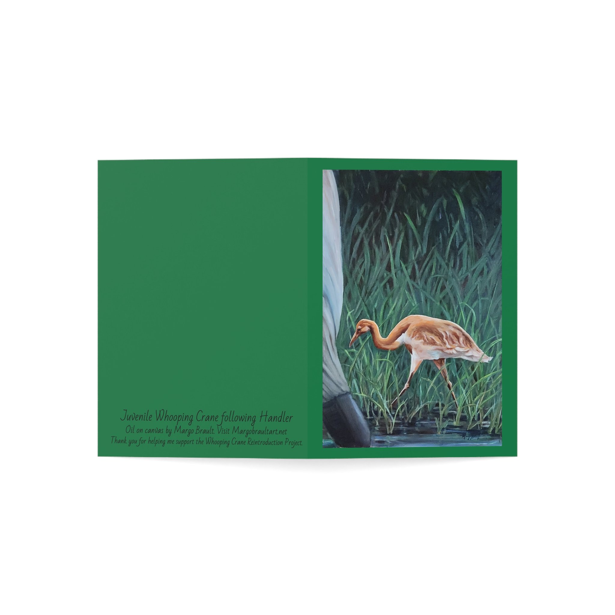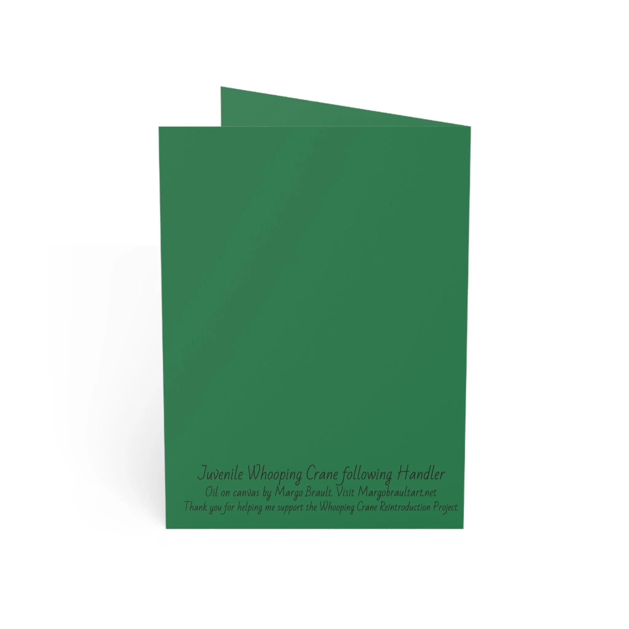 Juvenile Whooping Crane following Handler. Pack of ten cards with envelopes. Blank inside. 4.9 x 3.5"