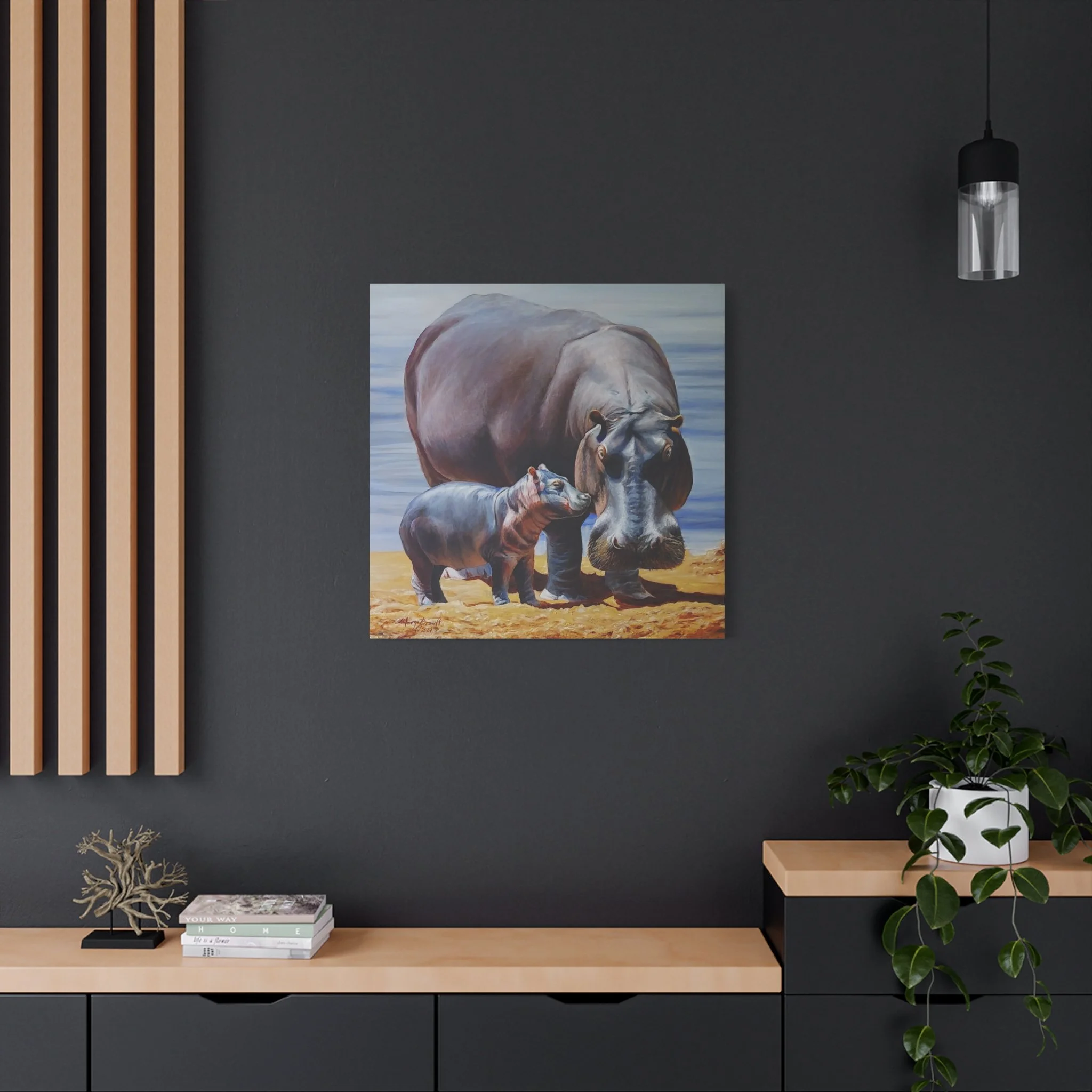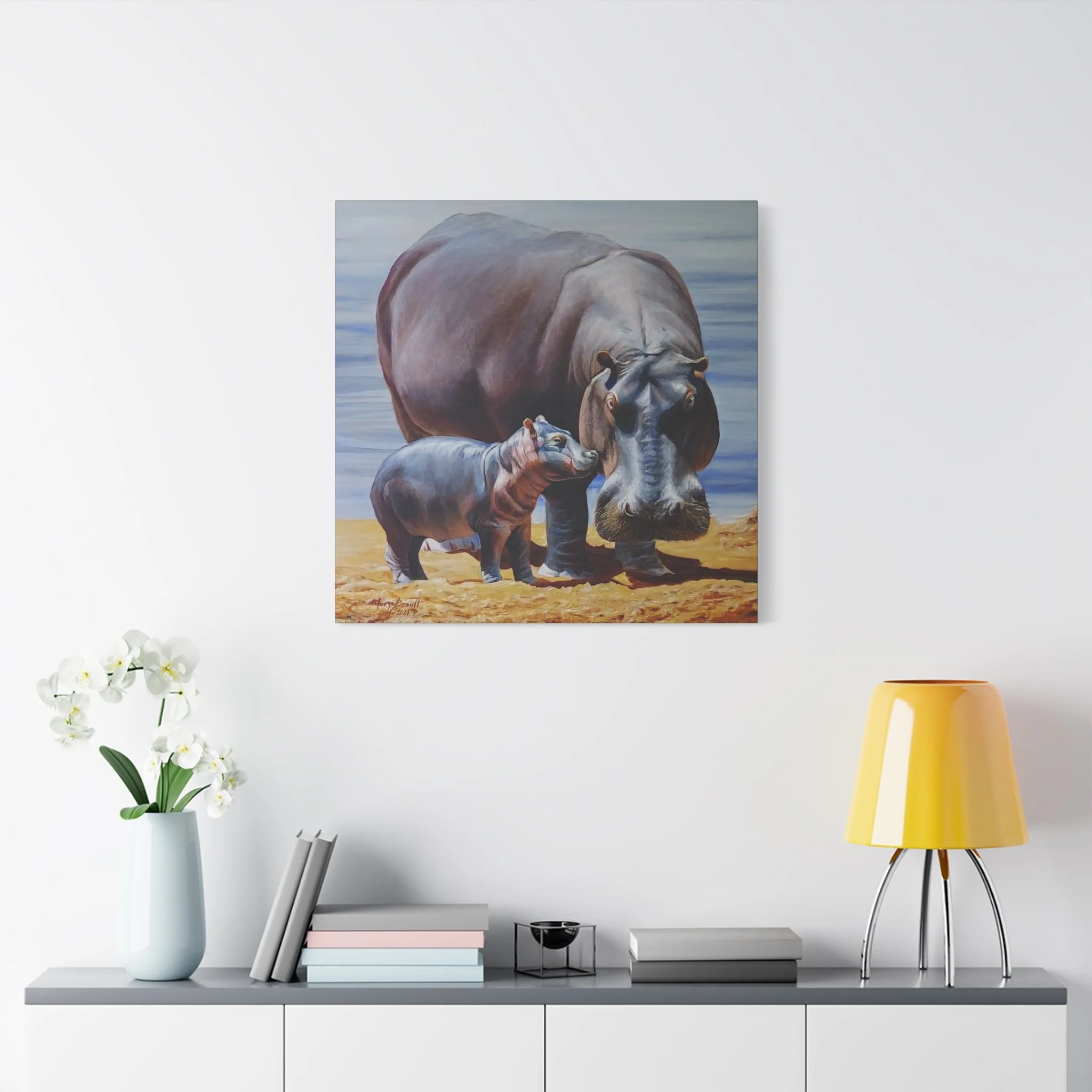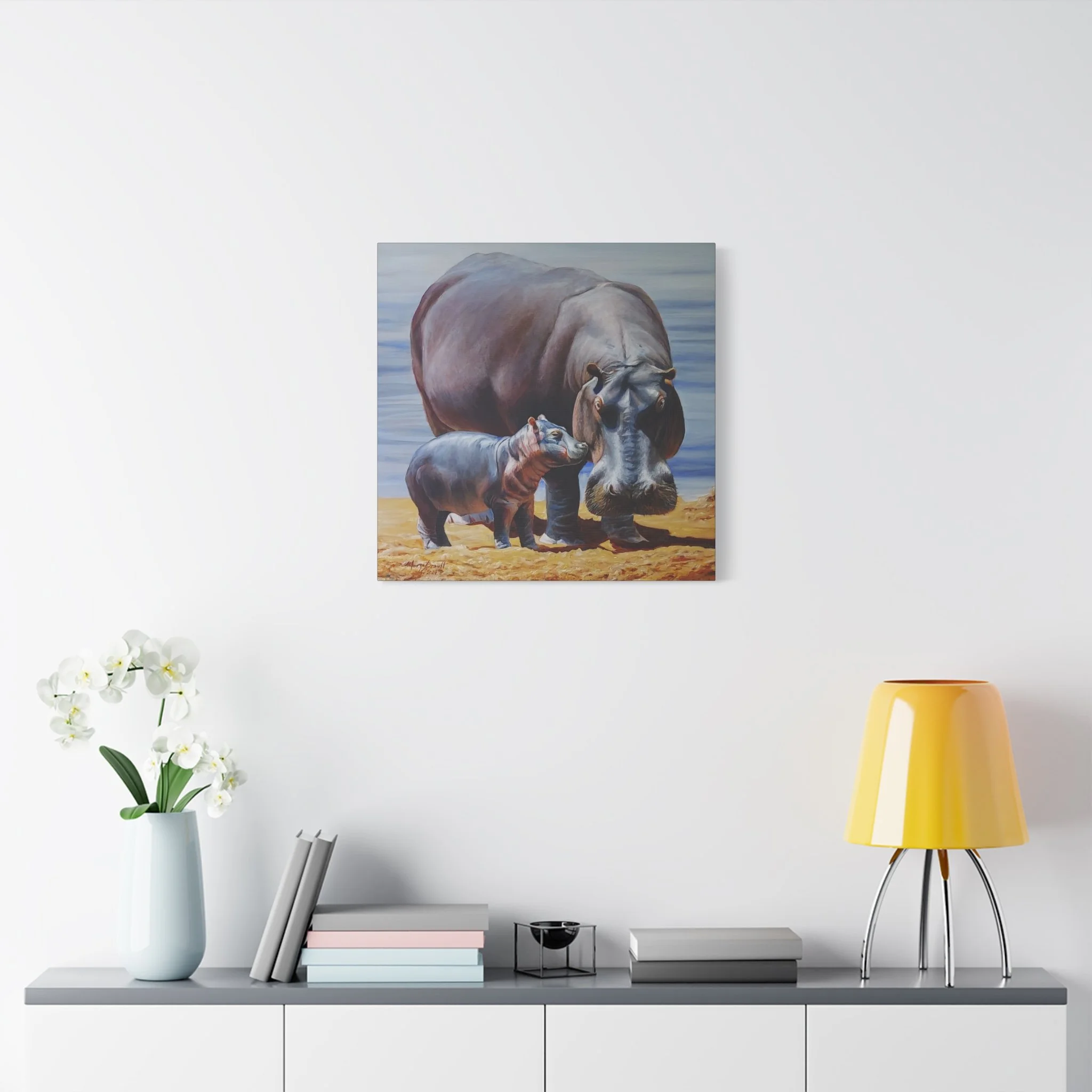 Mother and Baby Hippos - Matte Canvas, Stretched, 1.25