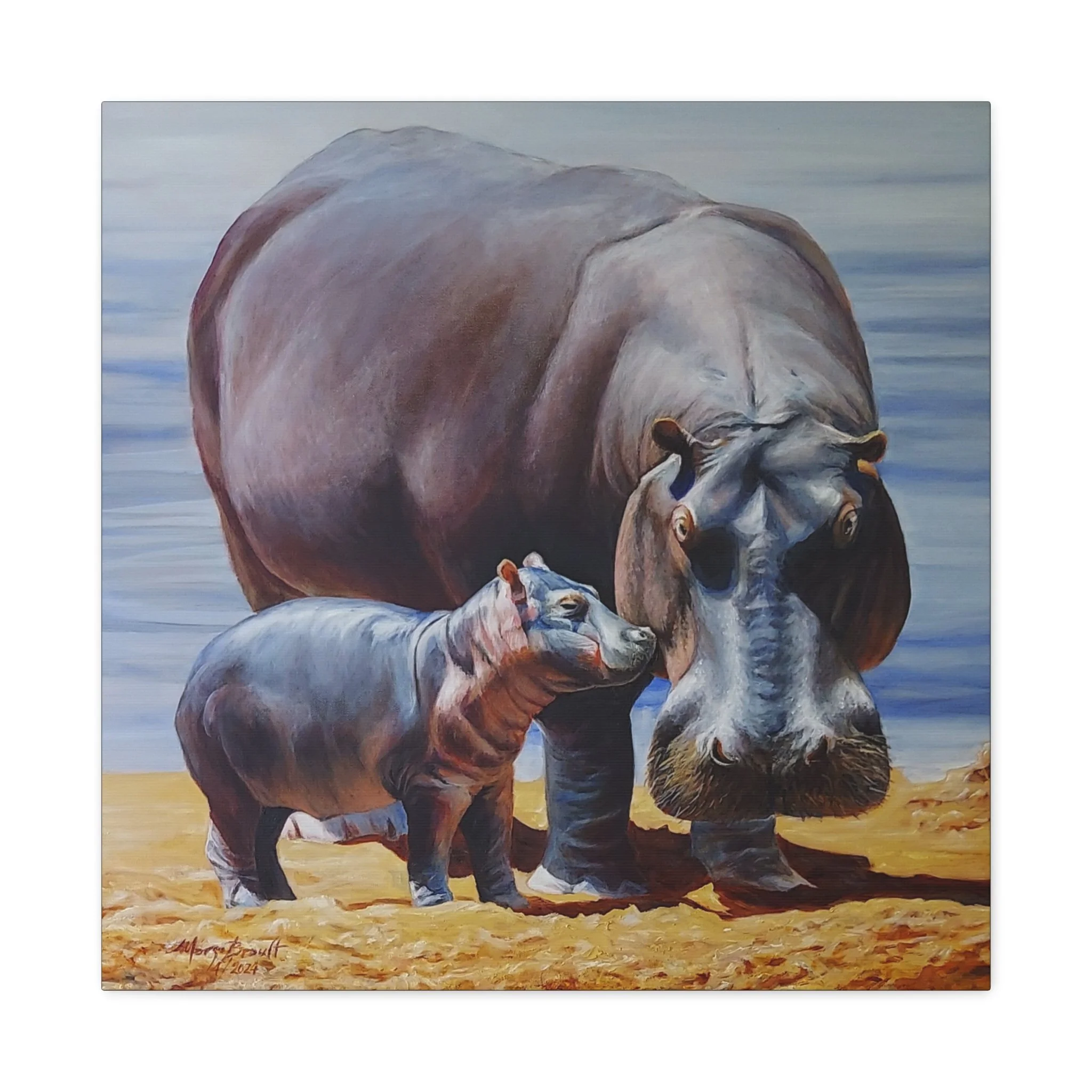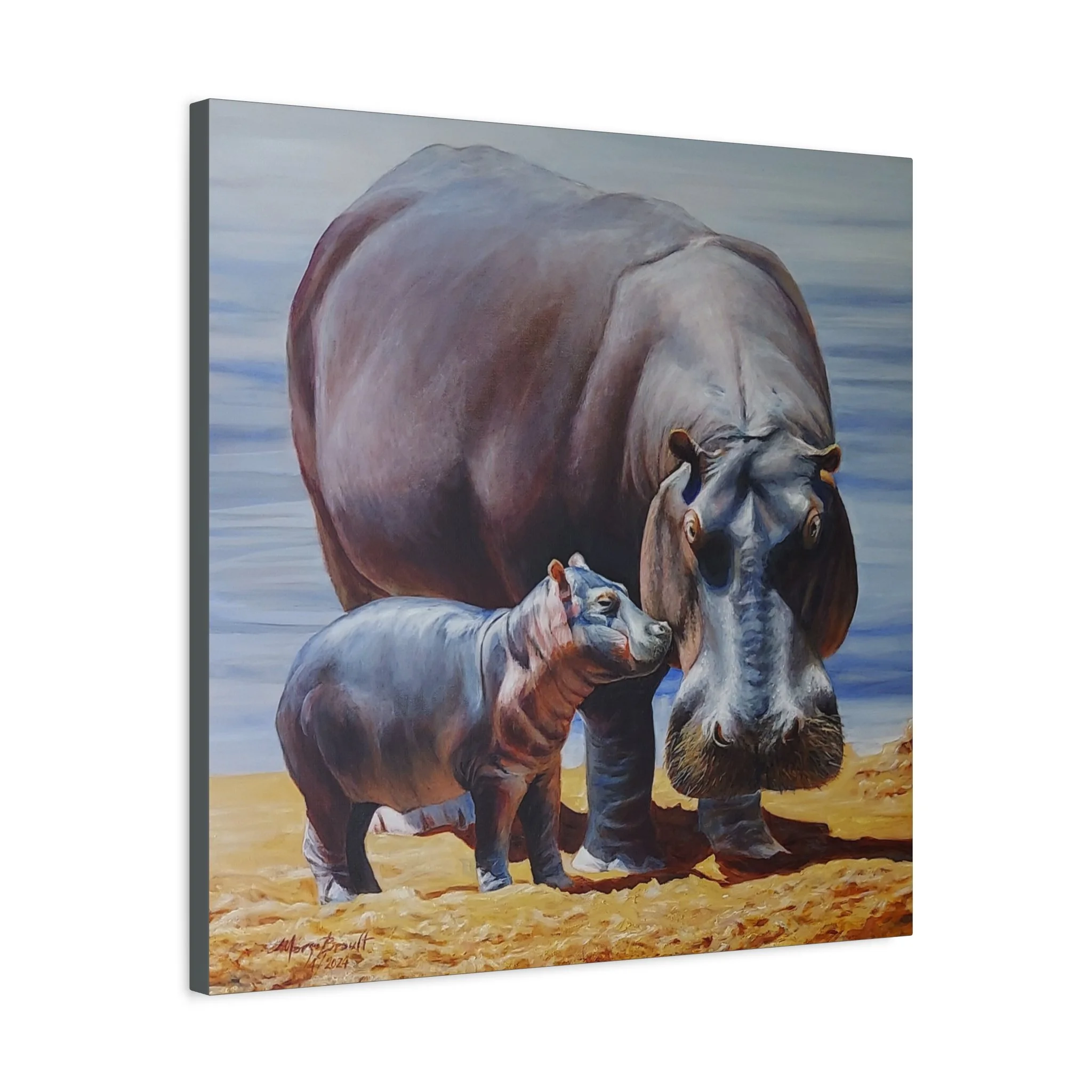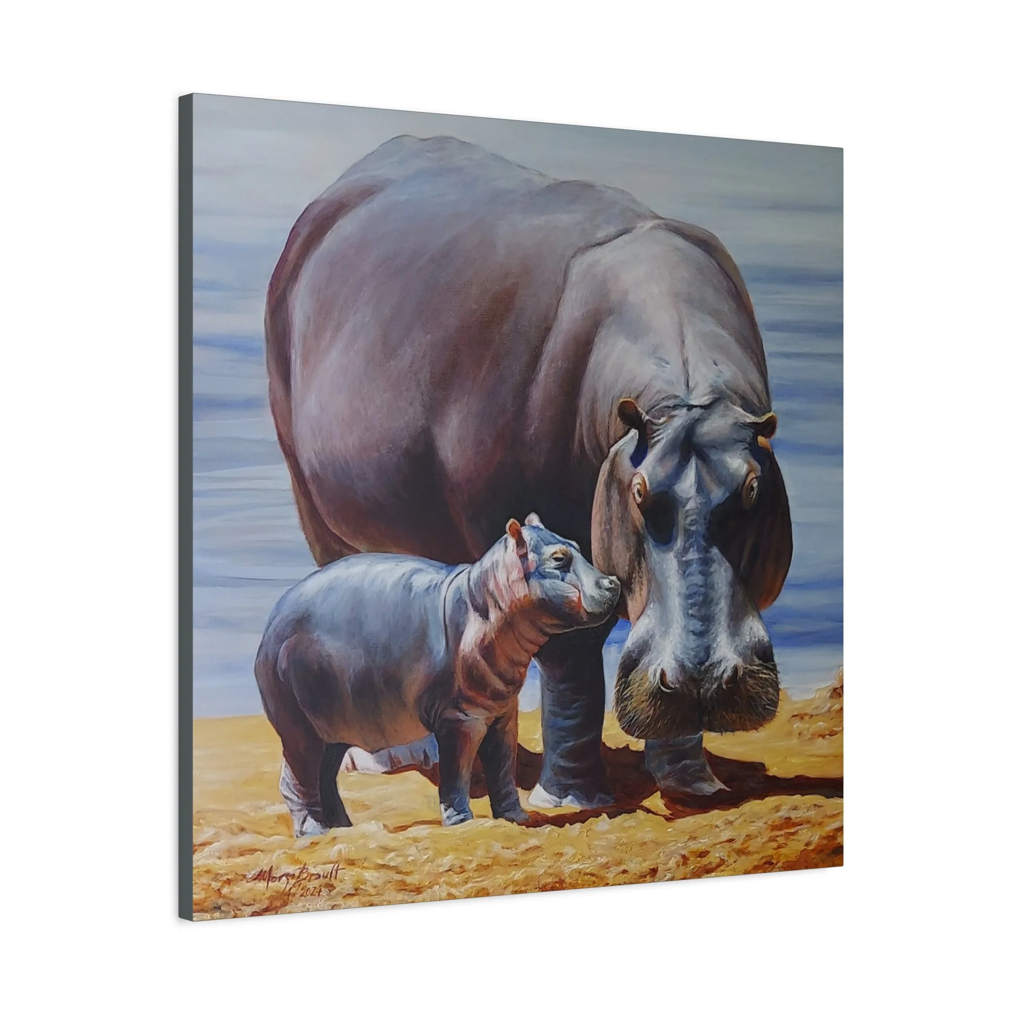 Mother and Baby Hippos - Matte Canvas, Stretched, 1.25