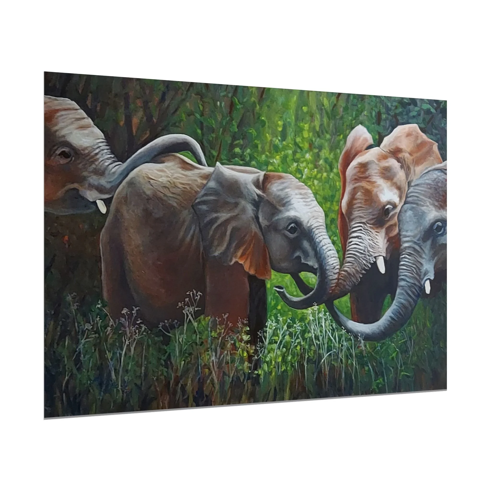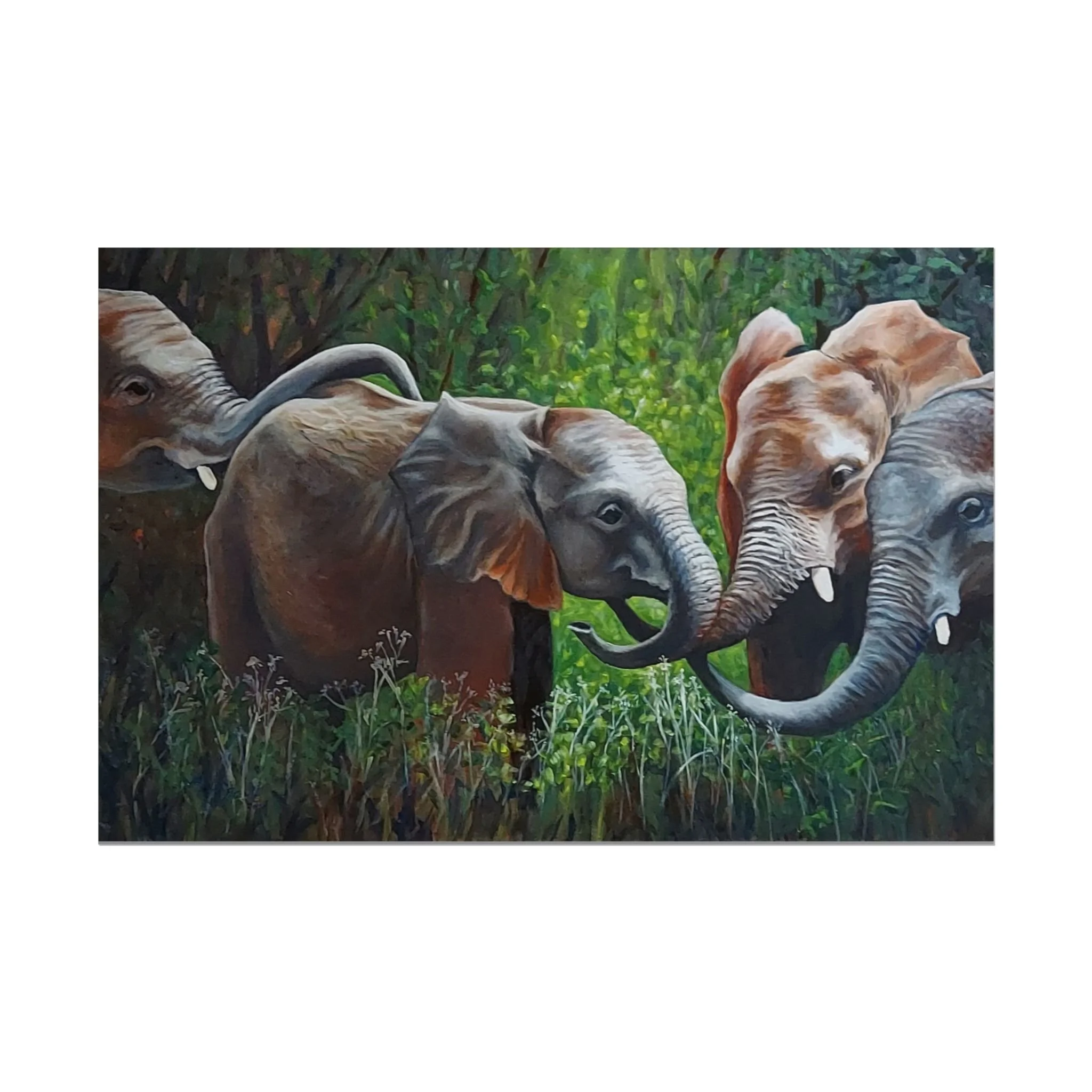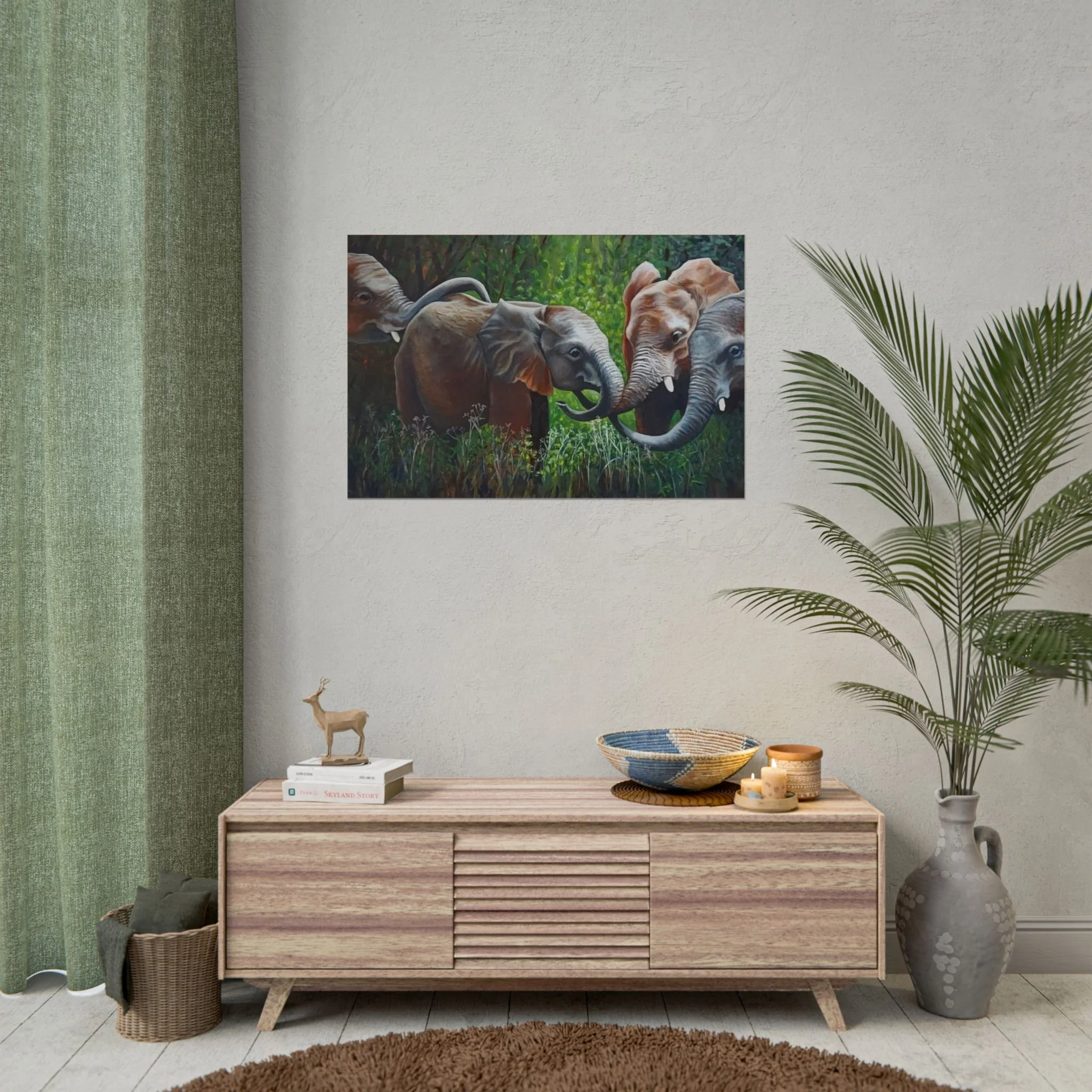 Orphaned elephant greeted by other orphans-Sheldrick Trust. Rolled Poster.